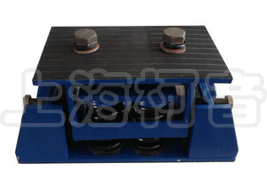 本產品上下表面粘有隔聲防滑橡膠墊。側向有橡膠阻尼塊,可調節阻尼力。上部配有螺栓孔可與設備連接,下部配有基礎連接孔。當減振系統剛度中心線與被減振設備系統重心線偏離,造成減振器靜態變形不一致時,可調節水平高度調節螺母,使減振器高度達到一致。
